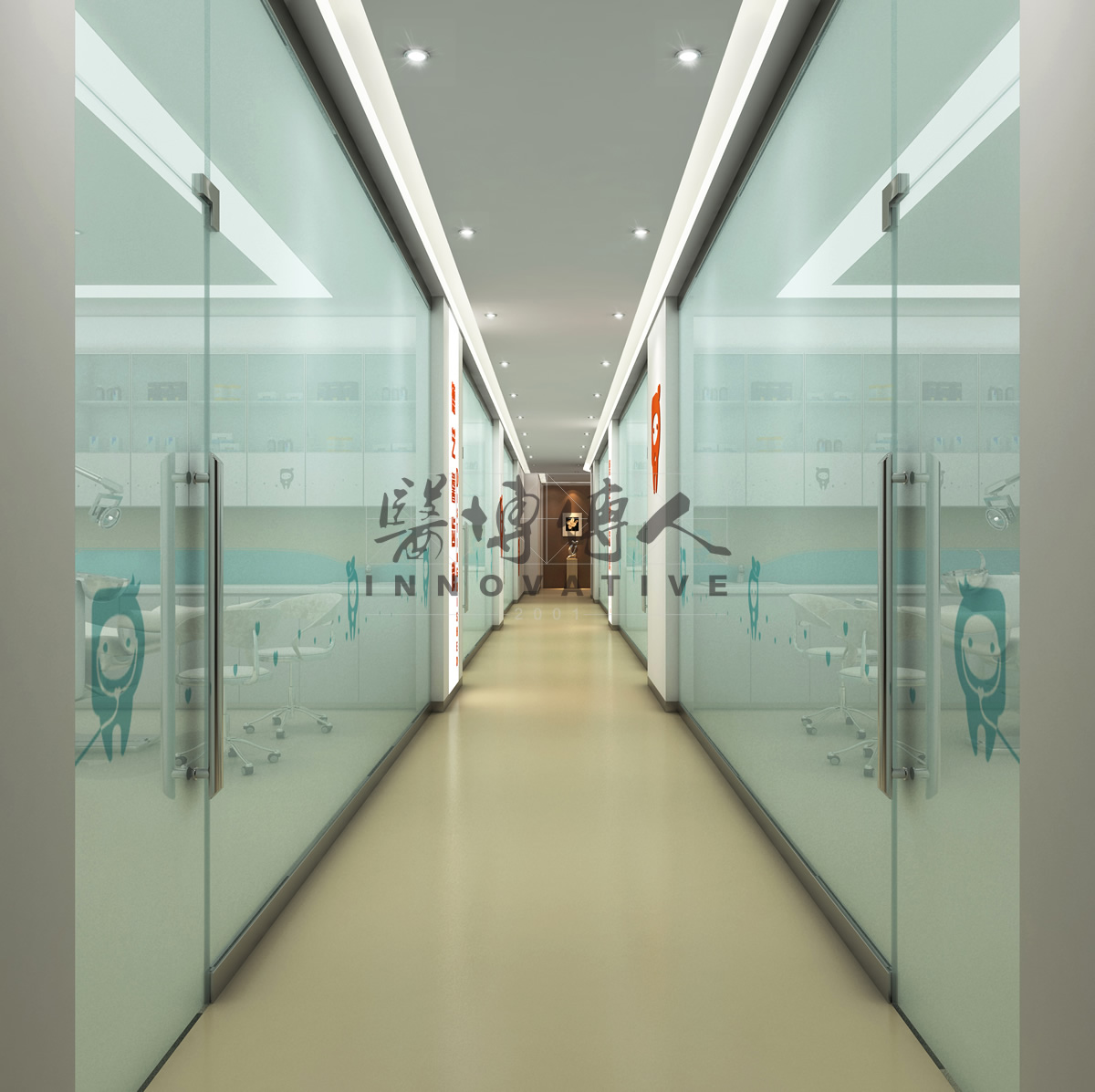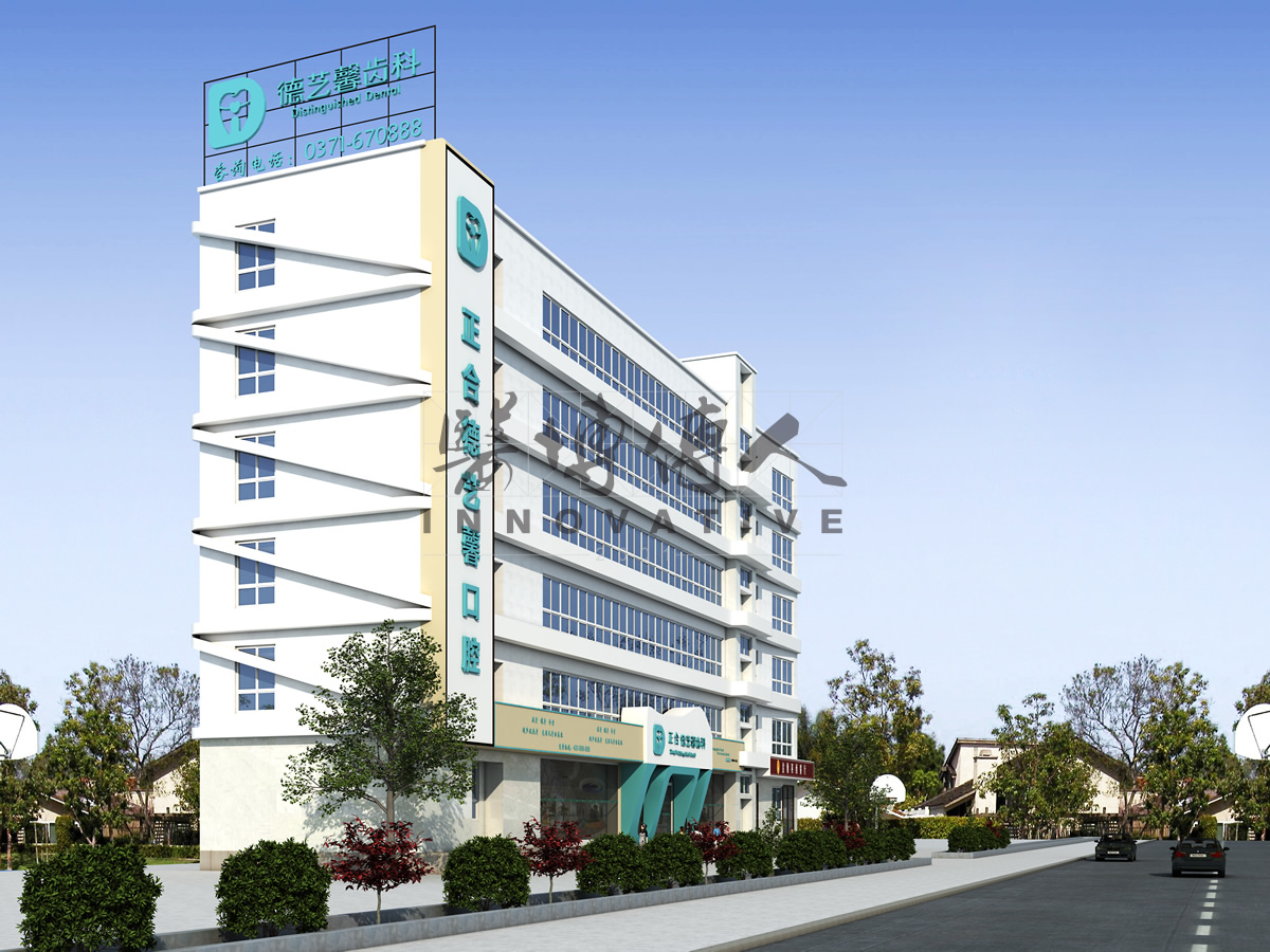 建筑形象简洁而富有细节,此外,医院logo鲜明且醒目,以人的“大牙”形状来传递医院的品牌形象,具有很强的标志性。