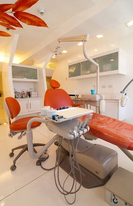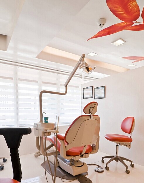 白色、深橙色的搭配打破了传统牙医的保守、单调的设计风格,还加上花的点缀,显得生机勃勃。